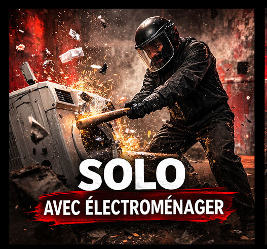 25 eurosAccès à la salle de défoulement en solo avec électroménager durant 15 minutes+Briefing de 5 minutes